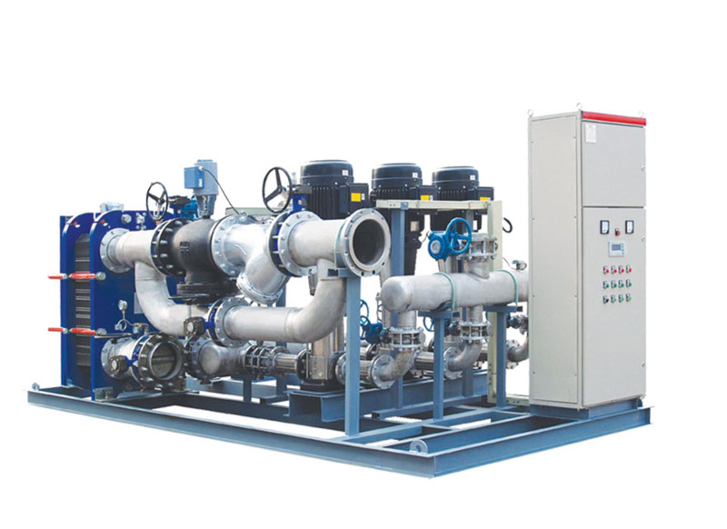 換熱機(jī)組的構(gòu)成及工作原理換熱機(jī)組是集成板式換熱器、循環(huán)泵、補(bǔ)水泵、電控柜、溫控裝置、各種傳感器、熱量計、溫度計、壓力表、管路和閥1門等于- -體,并組裝在公共底座上的熱交換成套組合裝置。一次側(cè)熱源(蒸汽、高溫水等),經(jīng)過除污器過濾后,進(jìn)入板式換熱器與二次側(cè)循環(huán)水進(jìn)行熱交換,然后返回一次側(cè)回水管網(wǎng)。二次側(cè)循環(huán)水經(jīng)過除污器過濾、循環(huán)泵加壓后,進(jìn)入板式換熱器與一次側(cè)熱源進(jìn)行熱交換,然后進(jìn)入二次側(cè)供水管...